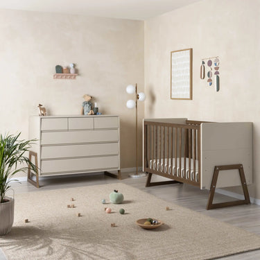 מיטת תינוק דגם רום בצבע חלב שקדים ואגוז, בסגנון מודרני עם קווים ישרים, ההופכת למיטת מעבר מעוצבת.