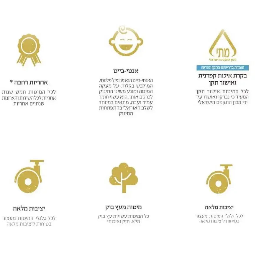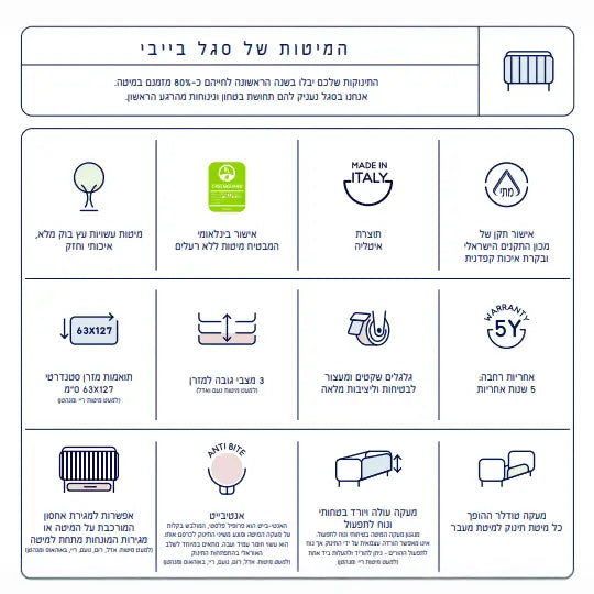 מיטה מעוצבת בקווים קלאסיים ונקיים, המתאימים למגוון סגנונות עיצוב. המיטה משדרת תחושת חמימות וביטחון, כשהיא יוצרת אווירה נעימה ומרגיעה בחדר התינוק. המיטה עשויה מעץ בוק מלא, חומר איכותי ועמיד, ומיוצרת באיטליה, מה שמבטיח איכות גבוהה לאורך זמן. חשוב לציין כי המיטה אינה מגיעה עם מעקה טולדר או מזרון, אותם יש לרכוש בנפרד.