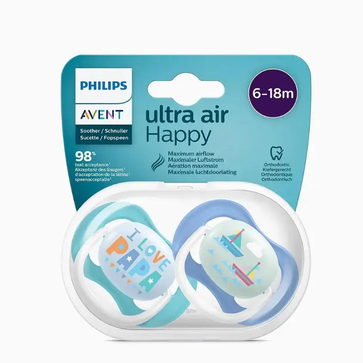 מוצצי אולטרא אייר "הפי" לתינוקות בני 6-18 חודשים הם מוצצים קלים ונושמים, בעלי פתחי אוויר גדולים שמתאימים לעורו הרגיש של התינוק, משאירים פחות סימנים ואינם מגרה את העור. הפטמה האורתודנטית רכה, בעלת מרקם משי מרגיע. ניתן לבצע חיטוי במיקרוגל באמצעות קופסת האחסון.