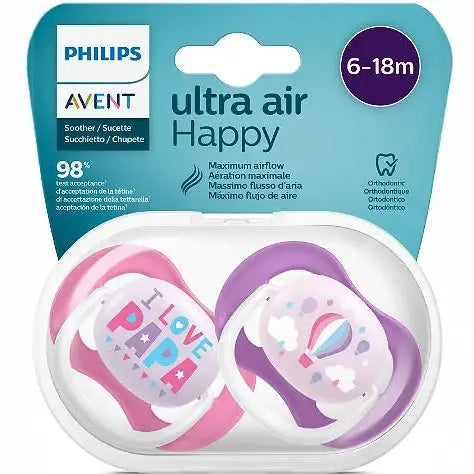 מוצצי אולטרא אייר "הפי" לתינוקות בני 6-18 חודשים הם מוצצים קלים ונושמים, בעלי פתחי אוויר גדולים שמתאימים לעורו הרגיש של התינוק, משאירים פחות סימנים ואינם מגרה את העור. הפטמה האורתודנטית רכה, בעלת מרקם משי מרגיע. ניתן לבצע חיטוי במיקרוגל באמצעות קופסת האחסון.