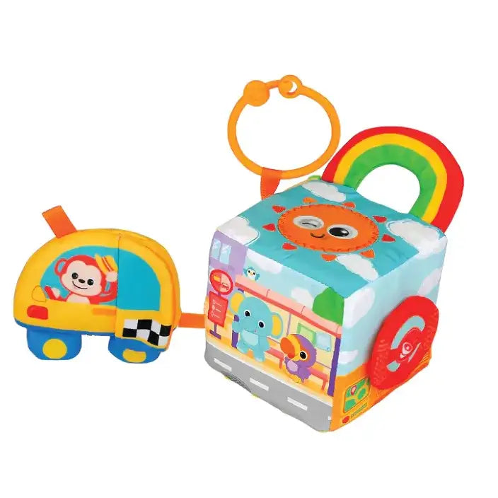 קוביית פעילות לתינוק רכה ונעימה למגע. עשויה מבדים עם מרקמים שונים המעודדים פיתוח מוטוריקה עדינה ומסקרנים את התינוק. הקובייה צבעונית עם הדפסים משעשעים המושכים את תשומת ליבו של התינוק, קופיף מצפצף ומראה דמי .