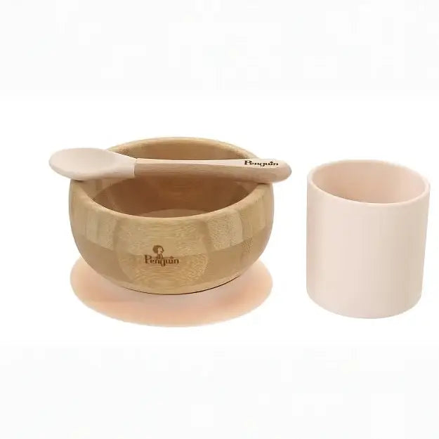 סט כלי אוכל לילדים ותינוקות מבמבוק וסיליקון אפרסק PENGUIN