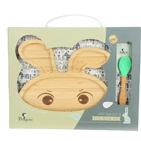 סט צלחת וכפית מבית Penguin עשויים מ-100% סיליקון ועץ במבוק איכותי. ללא BPA וללא פתאלאטים. לעידוד אכילה עצמאית של פעוטות וילדים.