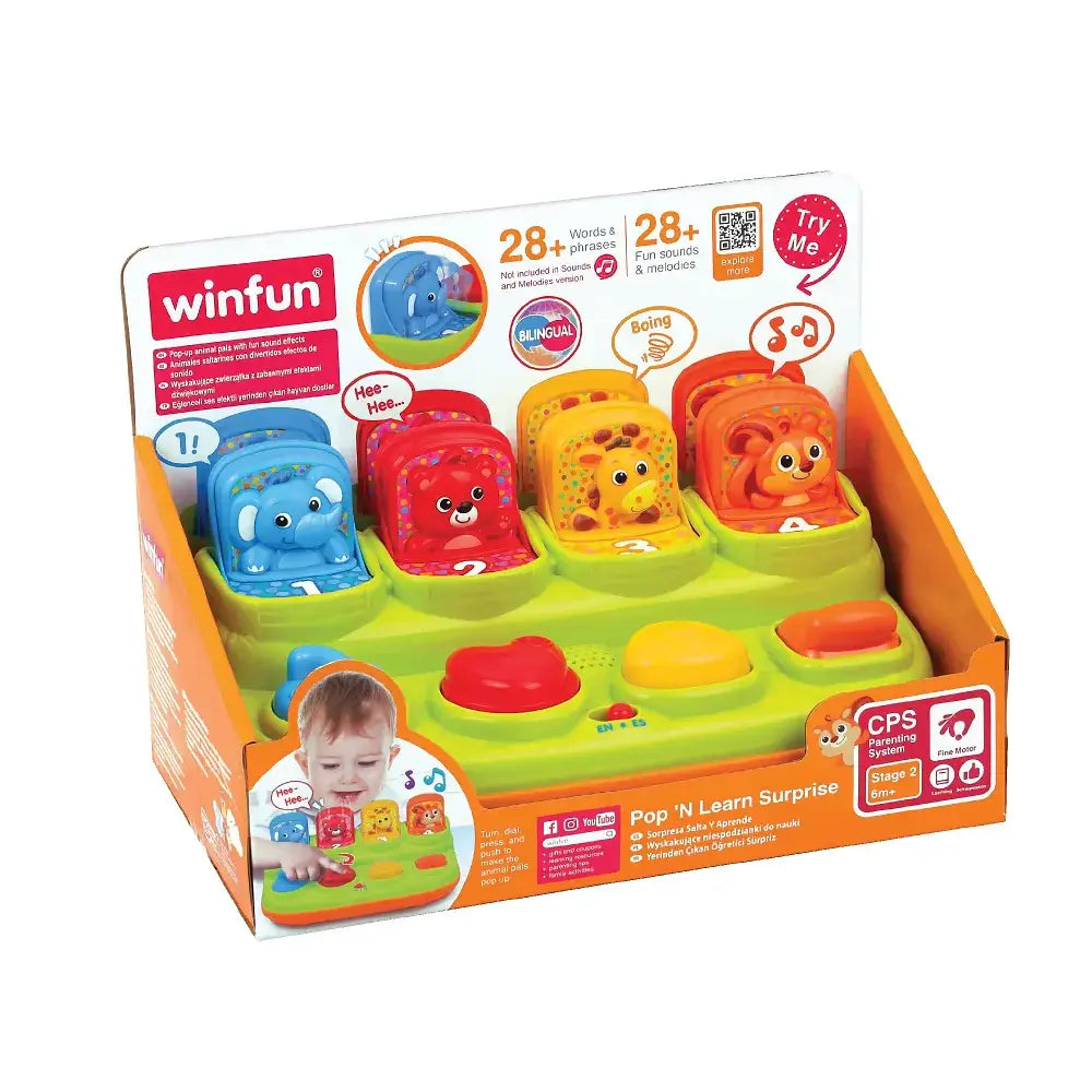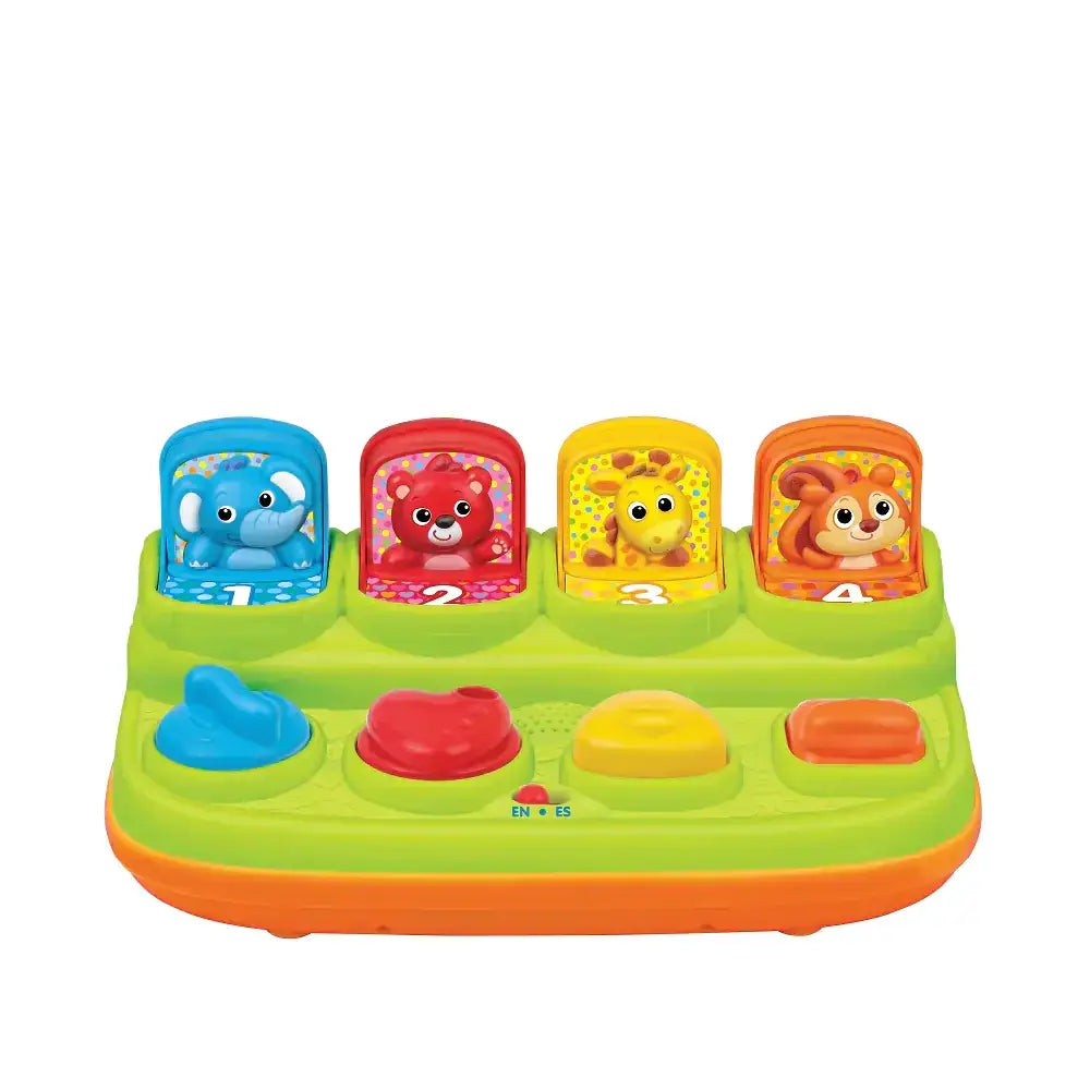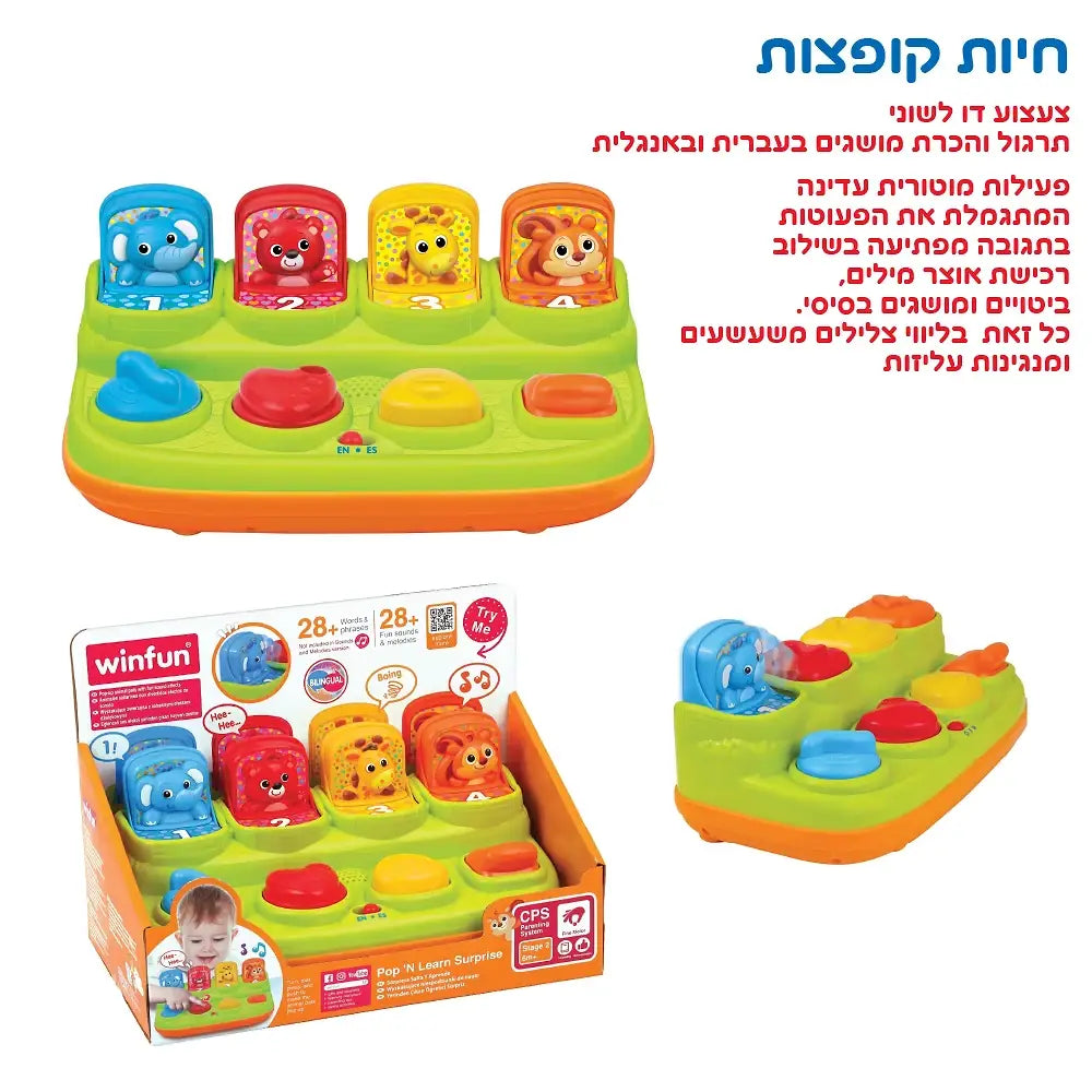 צעצוע דו-לשוני לתרגול והכרת מושגים בעברית ובאנגלית. כולל פעילות מוטורית עדינה שמתגמלת את הפעוטות בתגובה מפתיעה, בשילוב רכישת אוצר מילים בסיסי, בליווי צלילים משעשעים ומנגינות עליזות