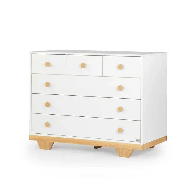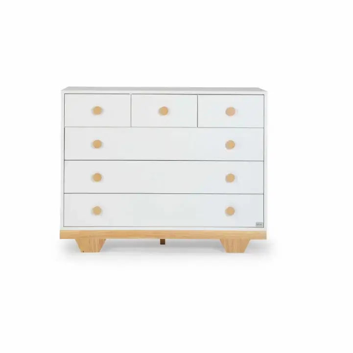 שידה רחבה בגודל 120 ס"מ, אלגנטית ומינימליסטית, שעוצבה בהשראת הטבע. הצבעוניות החמה, המשלבת עץ טבעי עם לבן, מעניקה לחדר אווירה חמה ומרגיעה. השידה עשויה MDF מלא, חזק ואיכותי, ומחולקת ל-6 מגירות המספקות אחסון רב, כך שתוכלו לשמור על סדר וארגון בחדר.