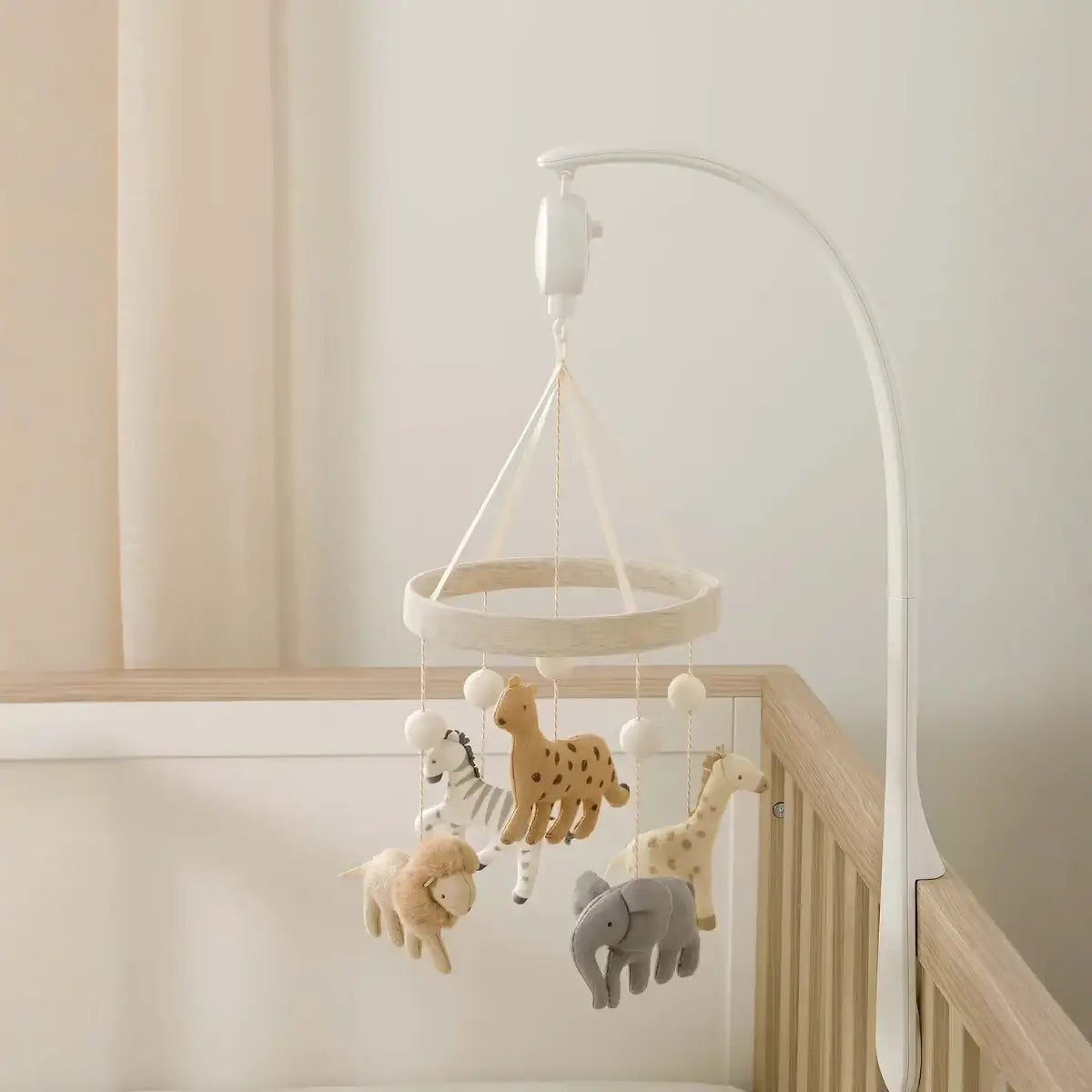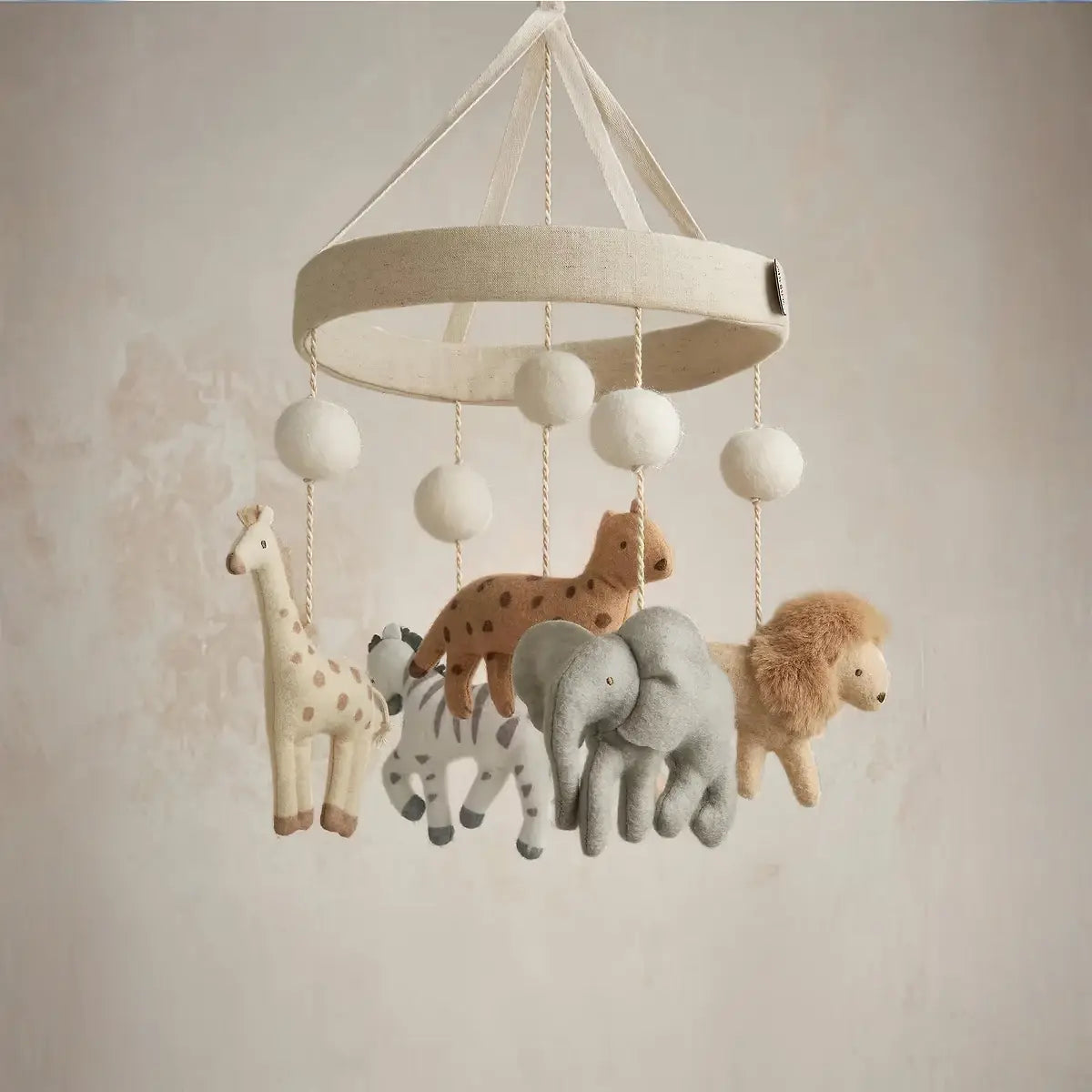 מובייל מוזיקלי מקסים ומעוצב עם דמויות של חיות תלויות. כולל חמישה חברים - זברה, אריה, פיל, צ'יטה, ג'ירפה - ופונפונים . עם פיצ'ר מוזיקלי עדין ומרגיע