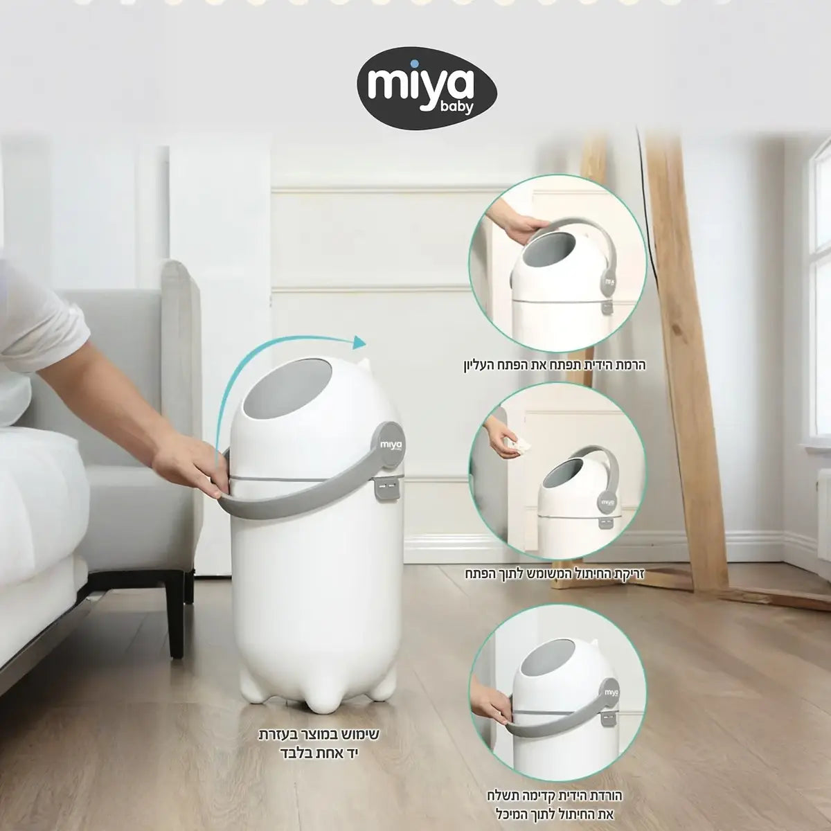 הפח נוח לשימוש במיוחד ב-3 תנועות פשוטות עם יד אחת, החיתול עובר מהפתח העליון לתוך מיכל האיחסון.