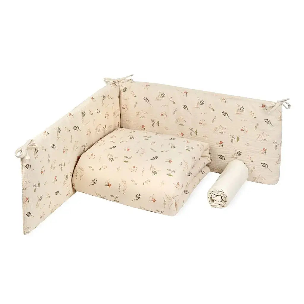 סט מצעים למיטת תינוק עשוי מבד רך ונעים 100% כותנה,הסט מורכב משלושה חלקים: שמיכה בגודל 75/115 ס”מ,מגן ראש עם חלוקה :66-64-66 ס”מ וסדין בגודל 17*130*70 ס"מ