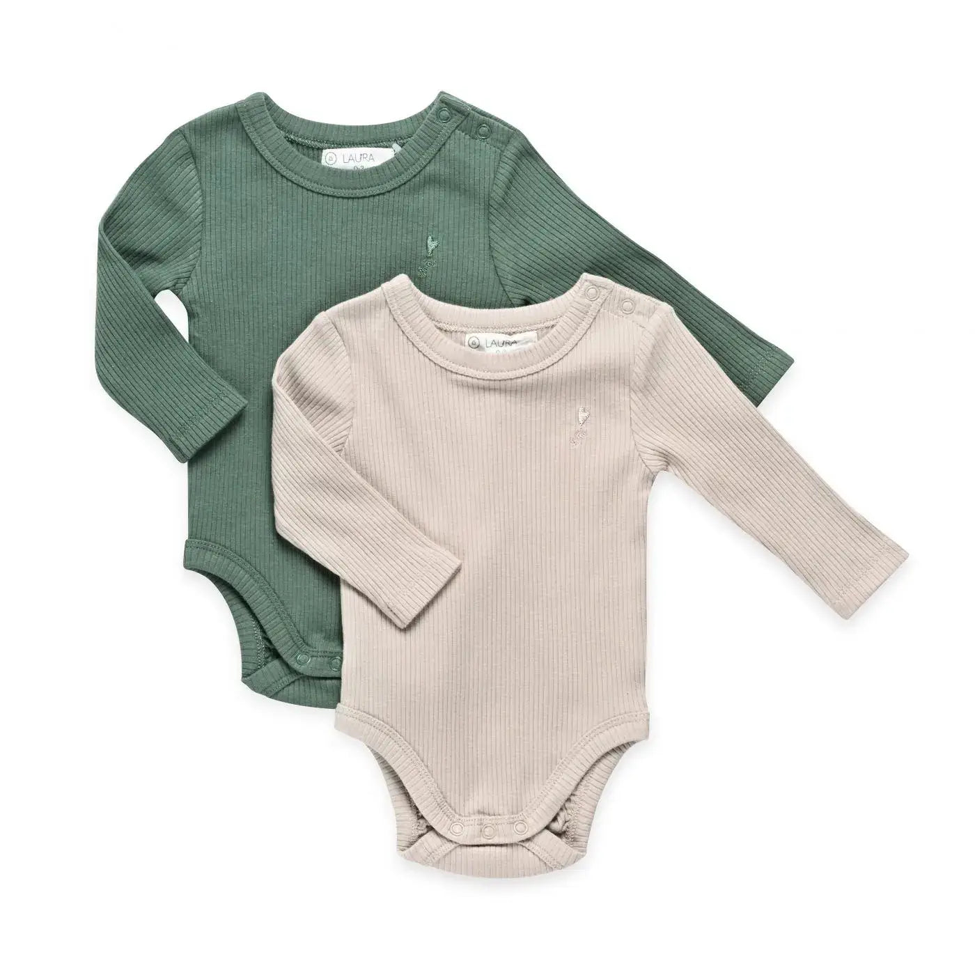 זוג בגדי גוף בצבעי ירוק ואפור בהיד מבד נעים ומלטף עבור התינוק עשויים מבד כותנה אורגנית רכה ונושמת