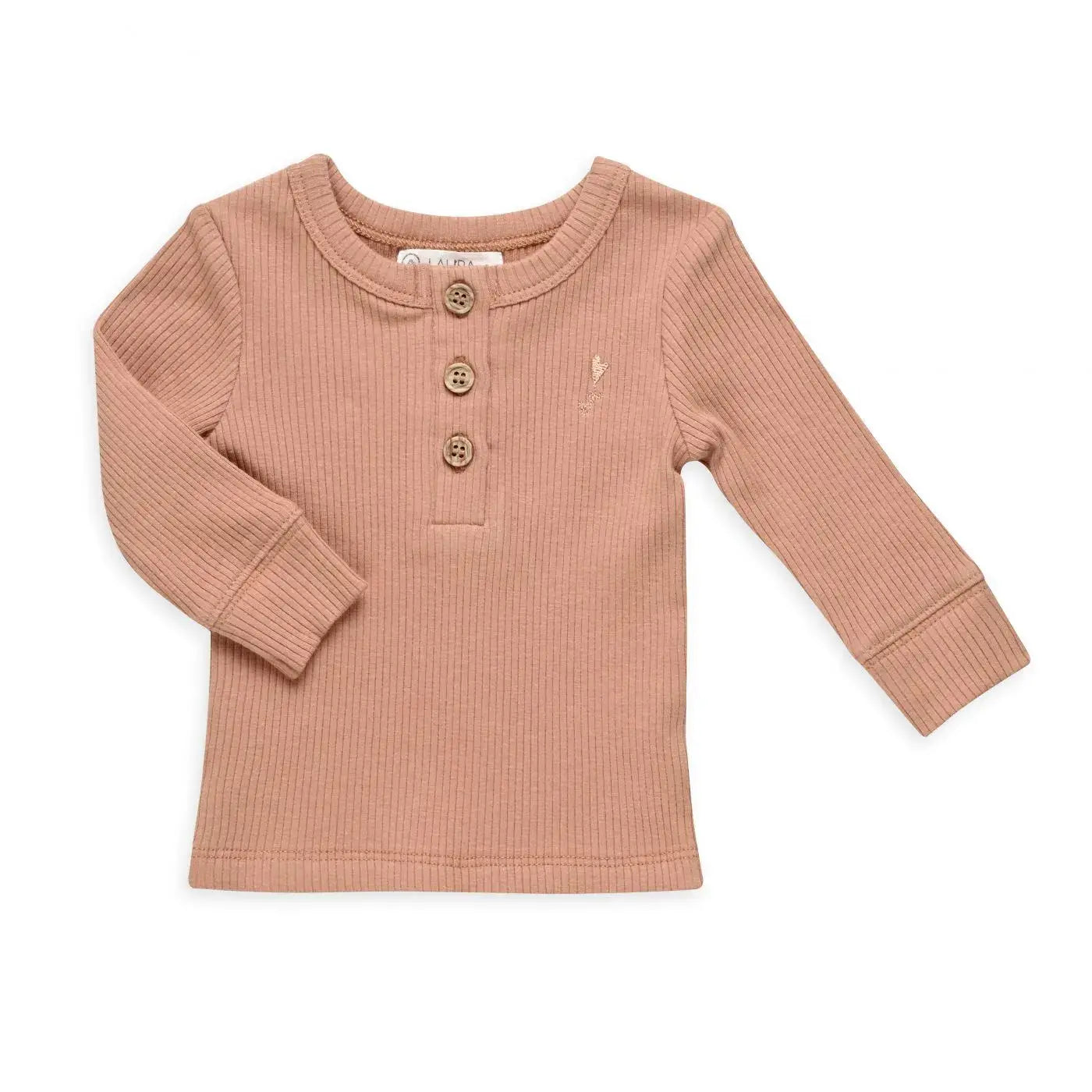 חולצת טי-שירט עם שרוולים ארוכים בצבע חום, עם עיצוב פשוט ונעים שמתאים לכל לוק של התינוק. עשויה מבד כותנה אורגנית רכה ונושמת