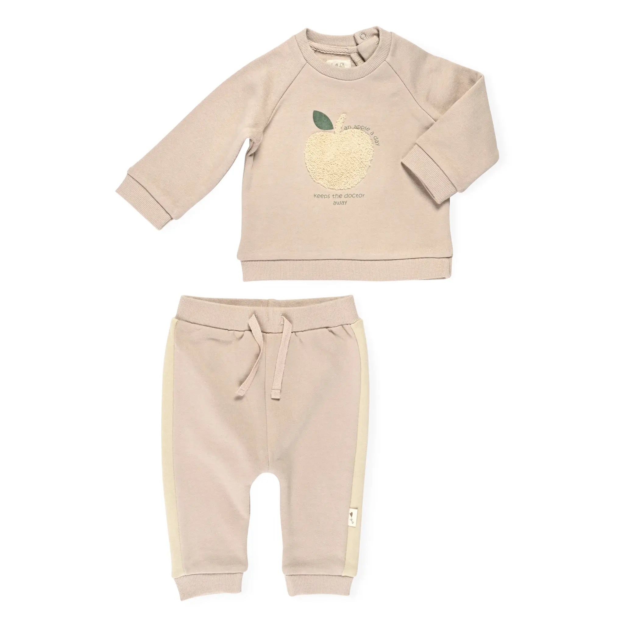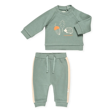 חליפת גן רכה ונעימה, מורכבת מסווטשירט עם פרינט מתוק ומכנסיים רכים עם סיומת גומי לתוספת נוחות.