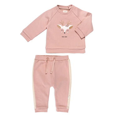 חליפת גן רכה ונעימה, מורכבת מסווטשירט עם פרינט מתוק ומכנסיים רכים עם סיומת גומי לתוספת נוחות.