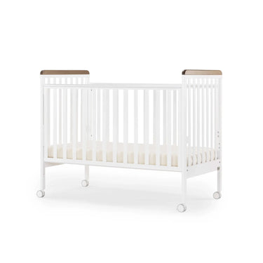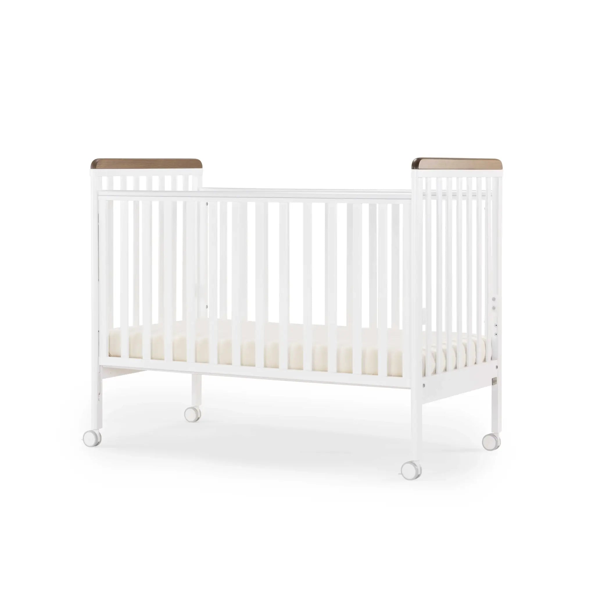 מיטת תינוק לבנה עם שילוב אגוז בעיצוב קלאסי ונקי, המשתלב בקלות עם מגוון סגנונות עיצוביים. המיטה עשויה עץ מלא איכותי ומיוצרת באיטליה ברמת גימור גבוהה.