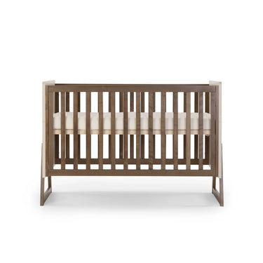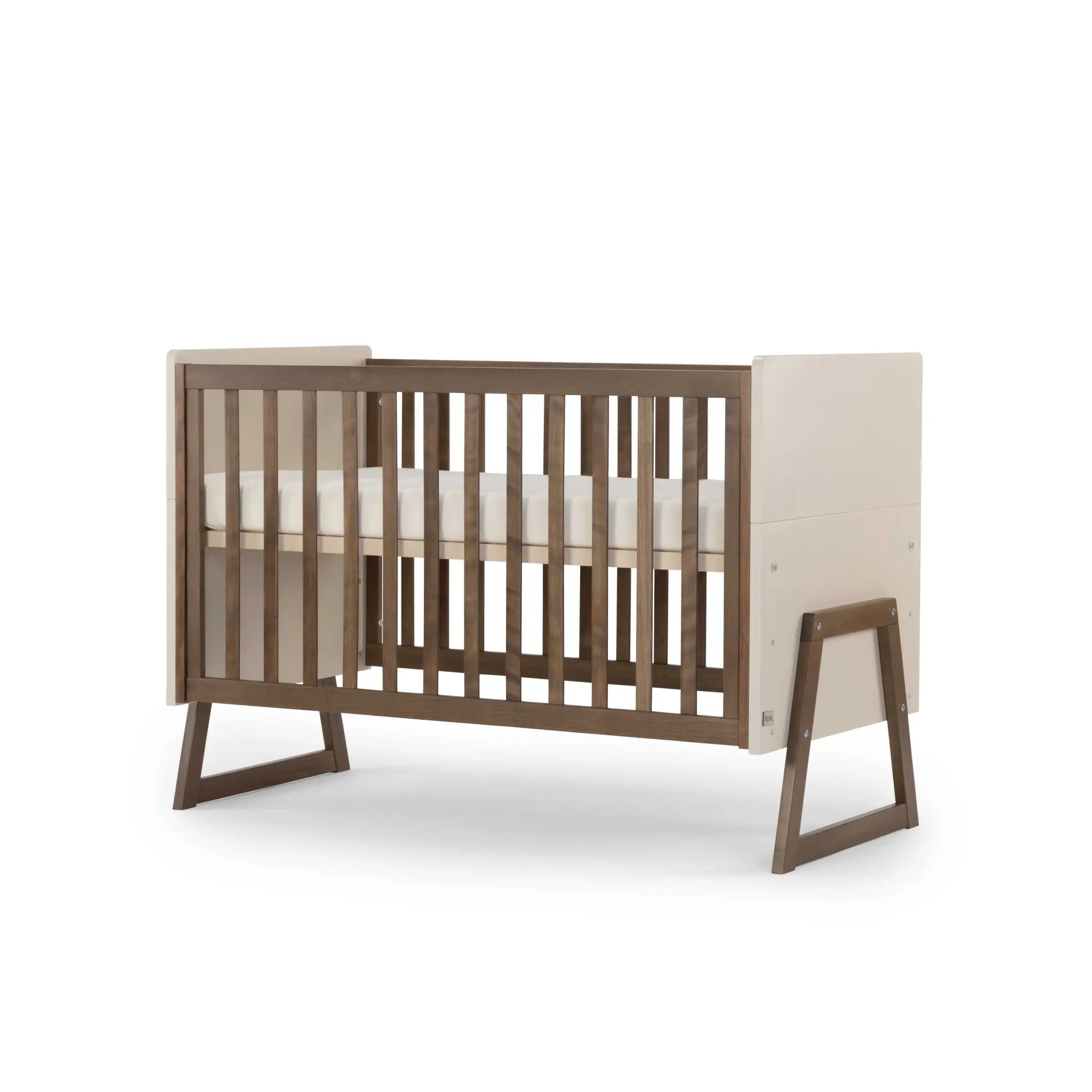 מיטת תינוק דגם רום בצבע חלב שקדים ואגוז, בסגנון מודרני עם קווים ישרים, ההופכת למיטת מעבר מעוצבת.