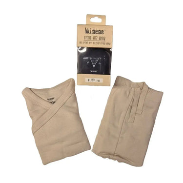 המארז מכיל מכנסיים וחולצה בצבע בז' וקופסא לאיחסון מוצצים.