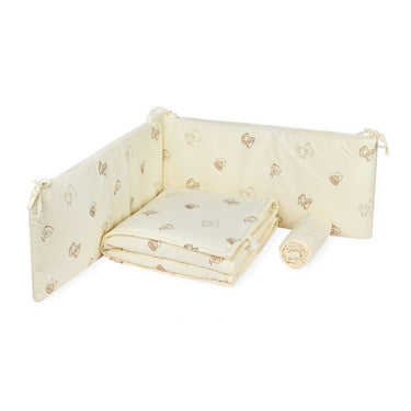 סט מצעים למיטת תינוק עשוי מבד רך ונעים 100% כותנה, הסט מורכב משלושה חלקים: שמיכה בגודל 75/115 ס”מ, מגן ראש עם חלוקה : 66-64-66 ס”מ וסדין בגודל 17*130*70 ס"מ