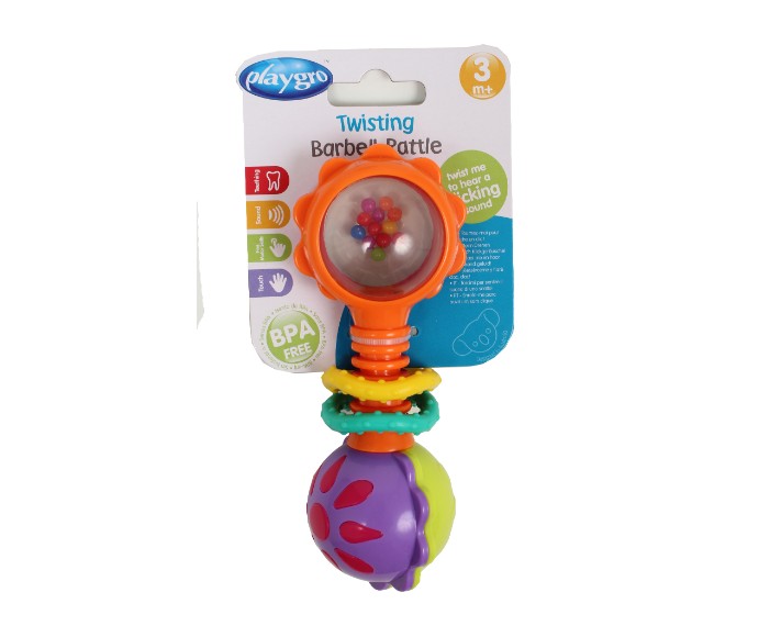 רעשן צבעוני מסתובב, עם חרוזים צבעוניים ושתי טבעות נשכן.