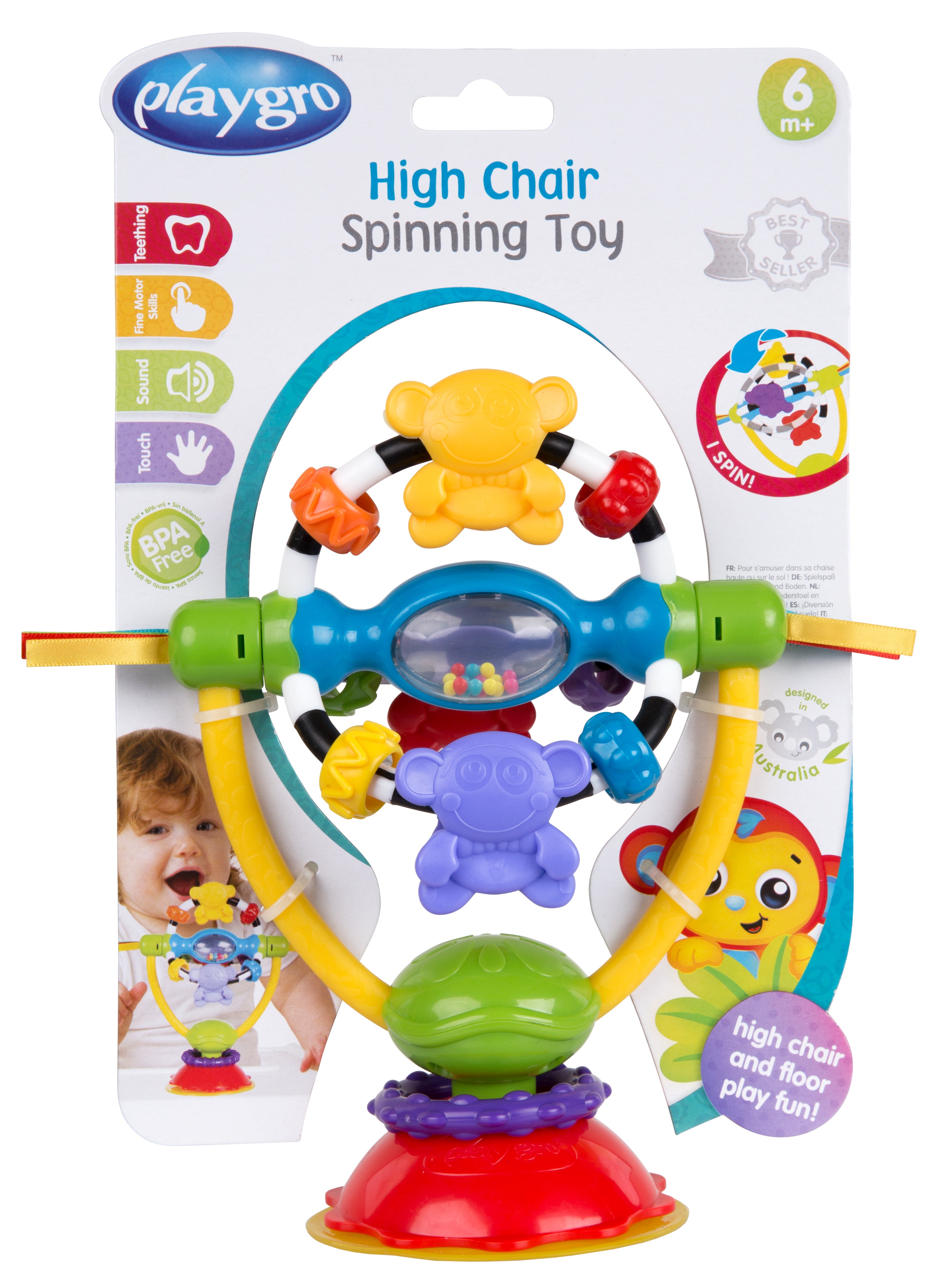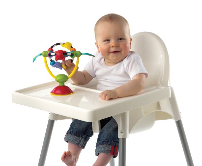 צעצוע המשעשע את התינוק כשאוכל בחוץ או בפנים. מיומנויות מוטוריות עדינות מגורות כאשר התינוק תופס את החרוזים המסתובבים ואת הסרטים.