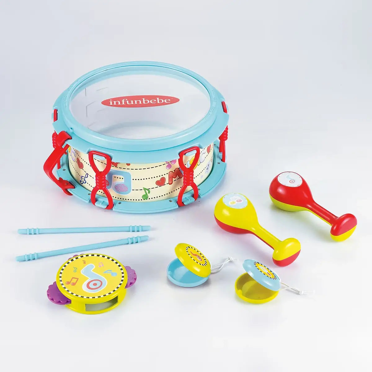 המארז מכיל: תוף, מקלות תיפוף, תוף מרים, קסטנייטות (ערמוניות) ומרקס.