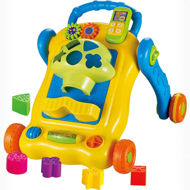 ההליכון כולל: טלפון נשלף, גלגלי שינים, גליל כדורים וחמש צורות הנדסיות צבעוניות