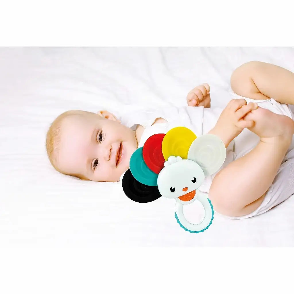 רעשן קטן ומתוק בצורת מניפת טווס , אידיאלי לגירוי הראייה אצל תינוקות במהלך החודשים הראשונים שלהם.