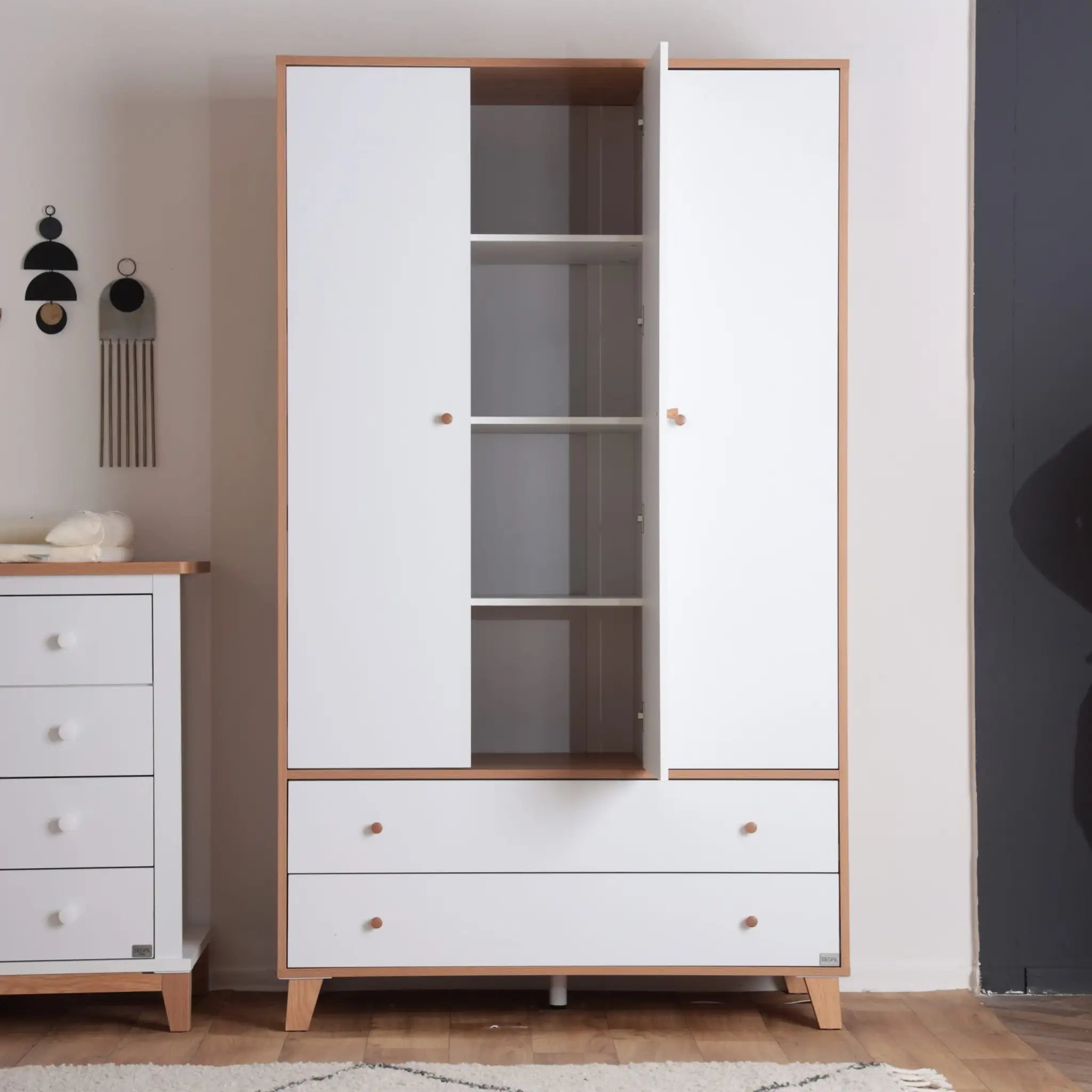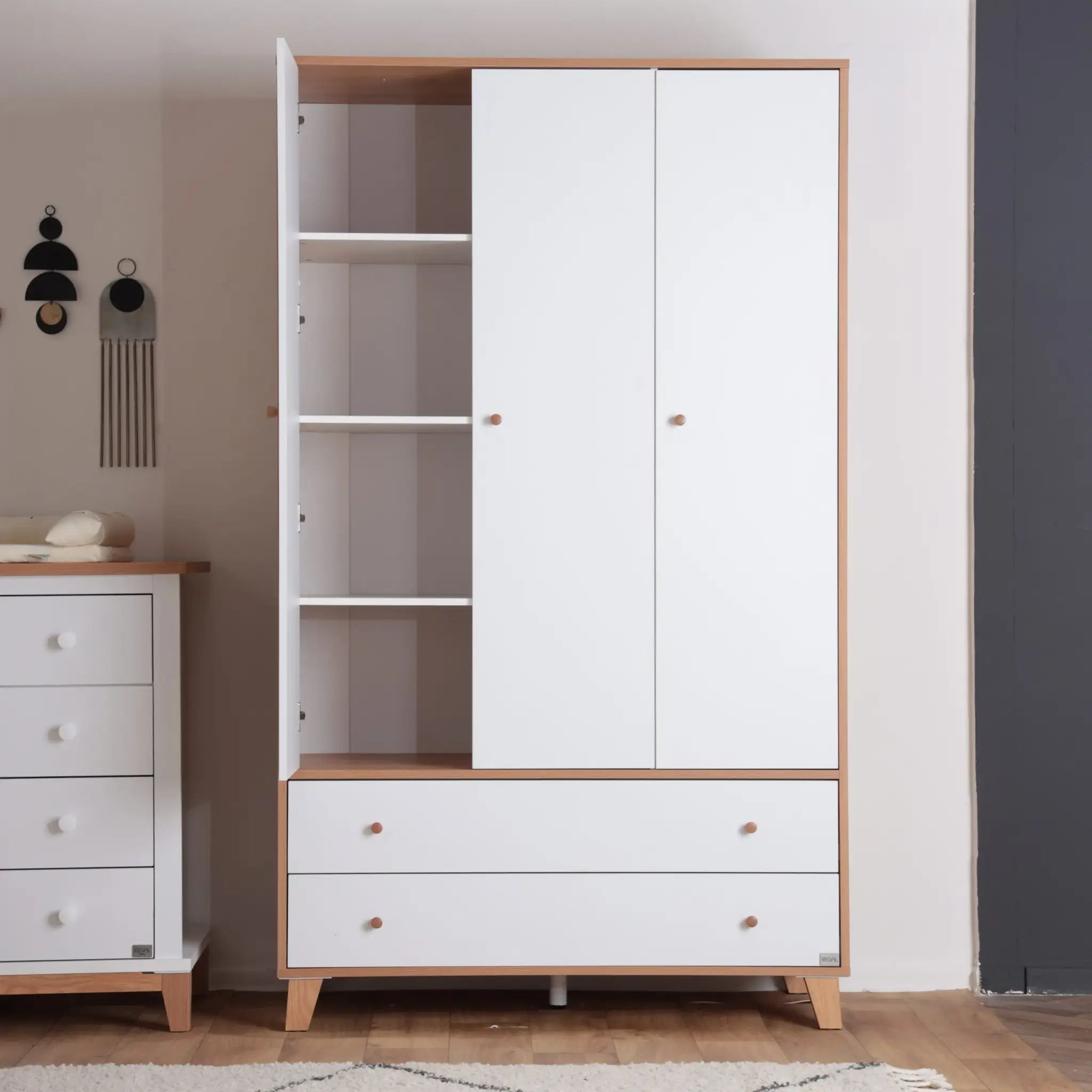 הארון מעוצב בקווים נקיים וישרים, מה שמעניק לחדר מראה מינימליסטי ועדכני. השילוב של מראה העץ מוסיף חמימות לחדר, בעוד חלוקת המגירות החכמה והפונקציונלית מאפשרת אחסון קל ונגיש. דלתות הארון מצוידות במנגנון טריקה שקטה, המבטיחות סגירה רכה ובטיחותית, לשמירה על בטיחות התינוקות והילדים.