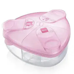 מיכל אחסון תחליף חלב מאפשר אחסון של 3 מנות תחליף חלב, כאשר כל מנה במשקל עד 40 גרם. הודות למבנה המשולש, ניתן למזוג בקלות את תחליף החלב אל הבקבוק. המיכל אידיאלי לשימוש מחוץ לבית וכולל מכסים ייחודיים לסגירה מאובטחת, המאפשרים פתיחה קלה לשימוש מהיר. הוא קומפקטי ונוח לאחסון בתיק החתלה. המיכל ניתן לניקוי וחיטוי באמצעות סטריליזטור או מדיח כלים.