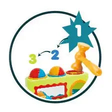 הפעוט מכה בפטיש ורואה איך הכדורים נופלים מטה, מגיע עם שלושה כדורים צבעוניים.