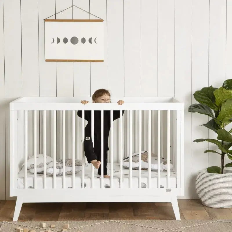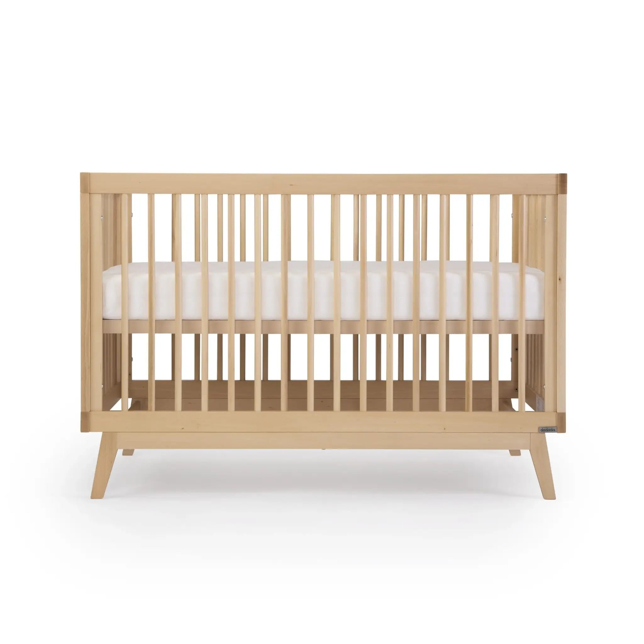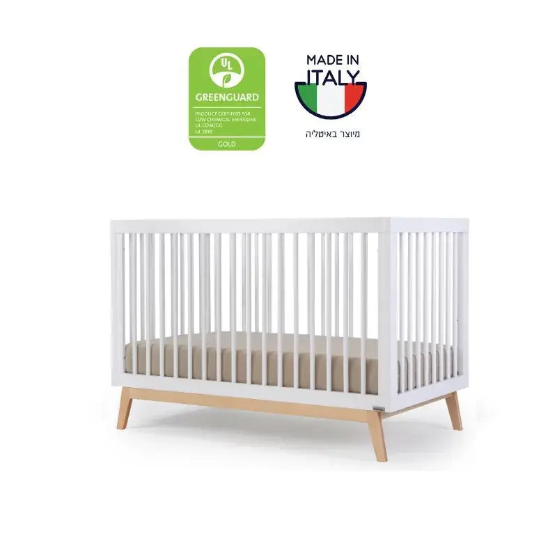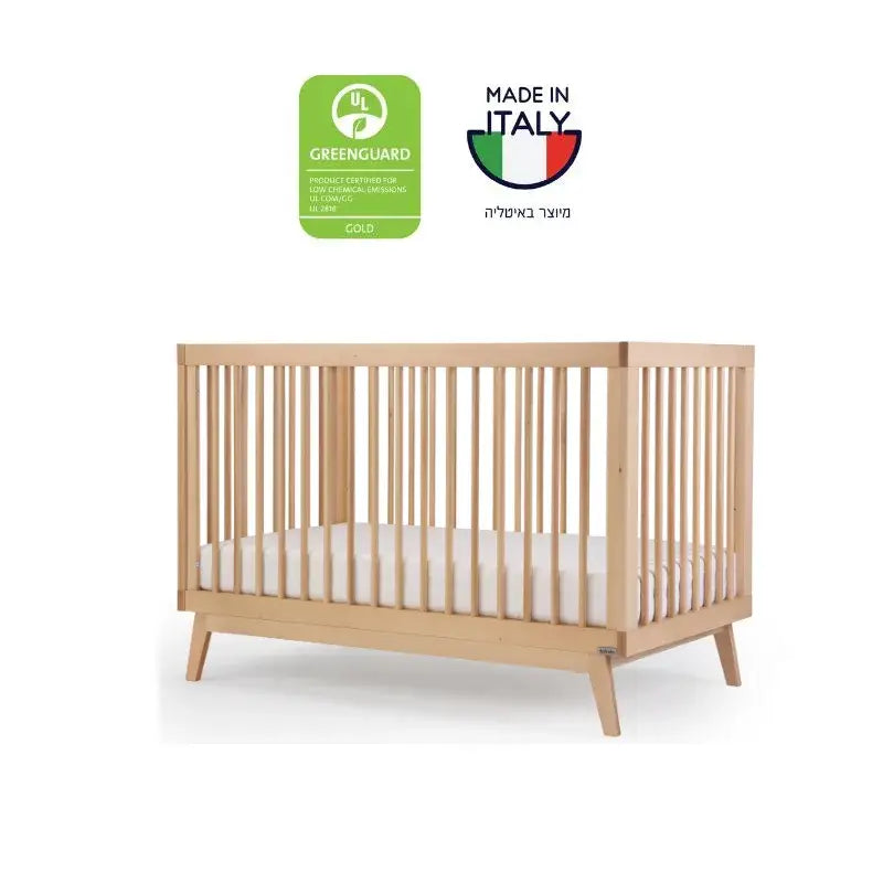 מיטת תינוק גדולה יותר ומעוצבת בקווים נקיים וישרים, עשויה מעץ בוק מלא, עמיד וחזק, עם אישור תקן ואישור בינלאומי של Greenguard. המיטה אינה כוללת מעקה טודלר ומזרן, אותם יש לרכוש בנפרד.