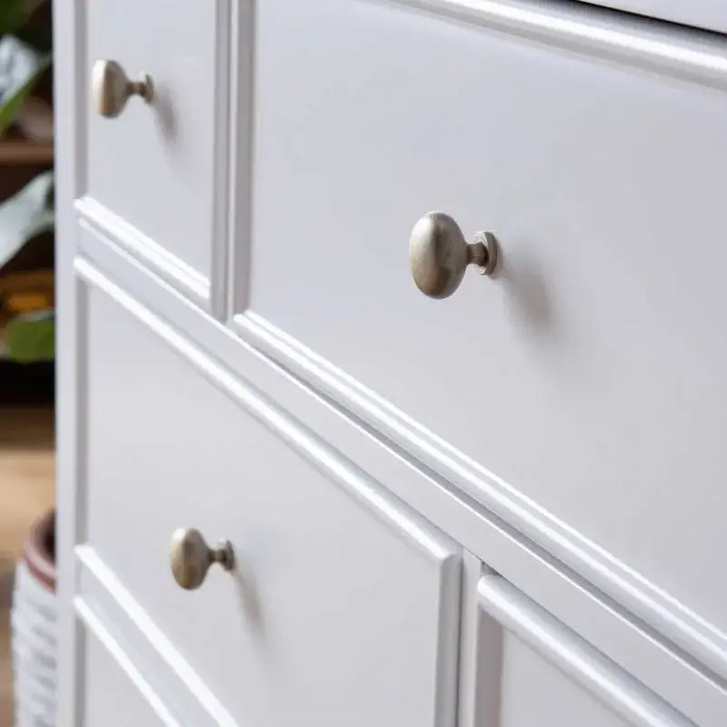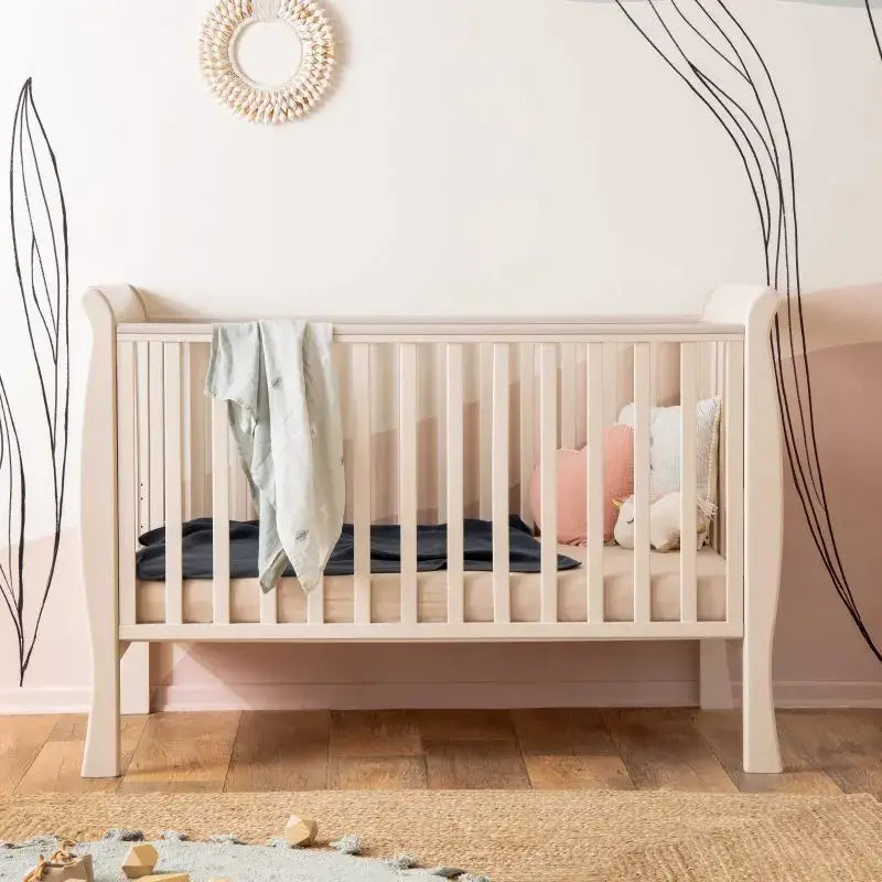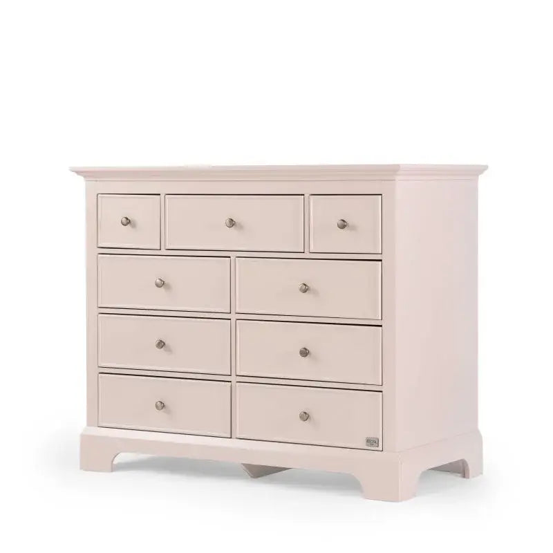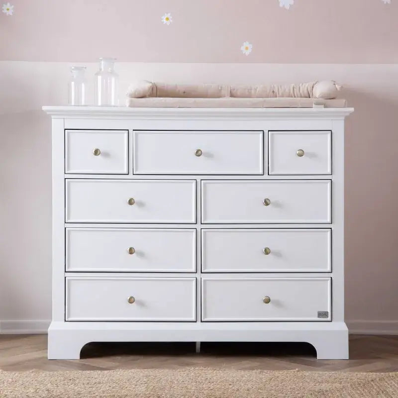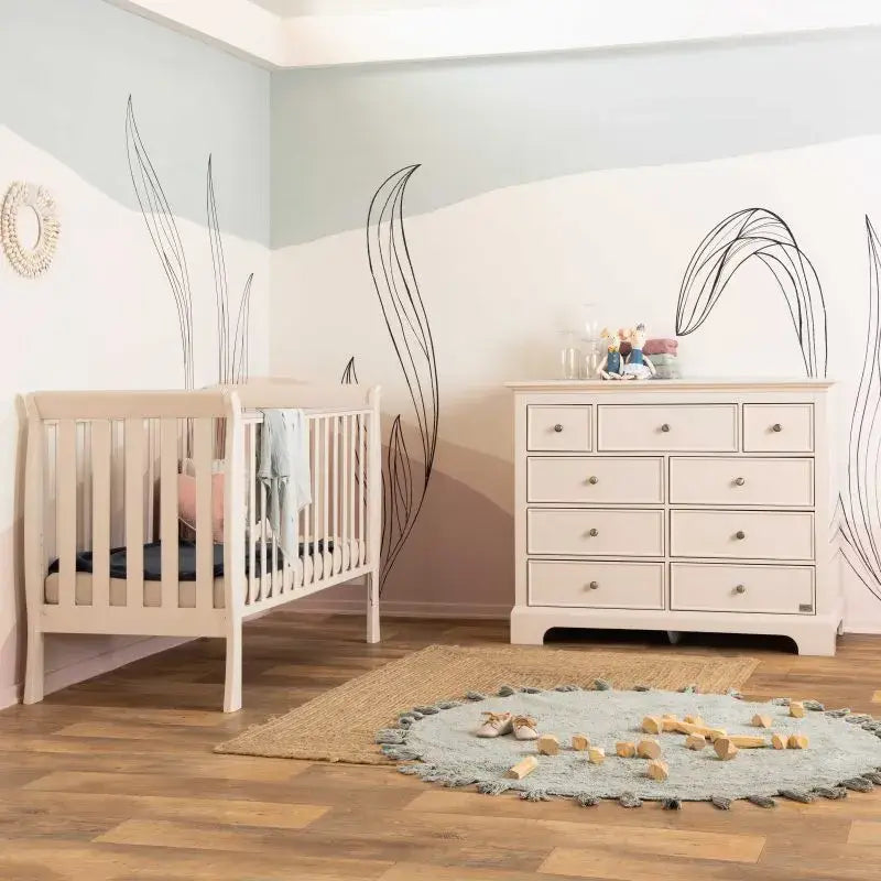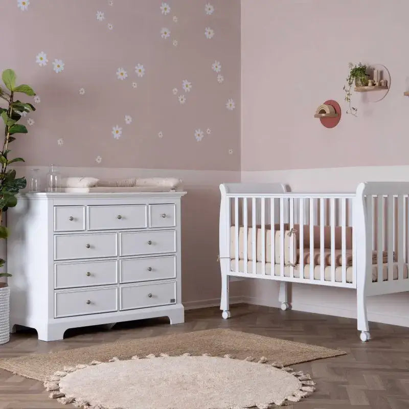חזית השידה, שתואמת באופן מושלם את עיצוב רגלי המיטה, מעניקה לחדר מראה מאוחד ומוקפד. שילוב הפריטים המודרניים עם ההשפעות הרומנטיות יוצר חדר תינוקות חמים, נעים ומעוצב באופן שמביא לשמחה ורוגע בכל פינה