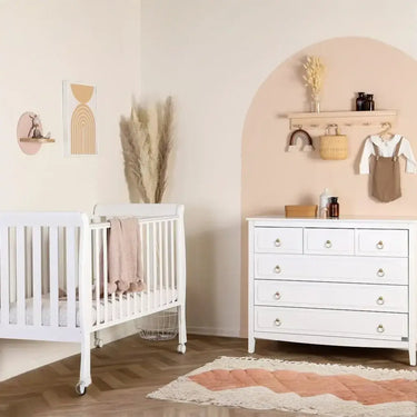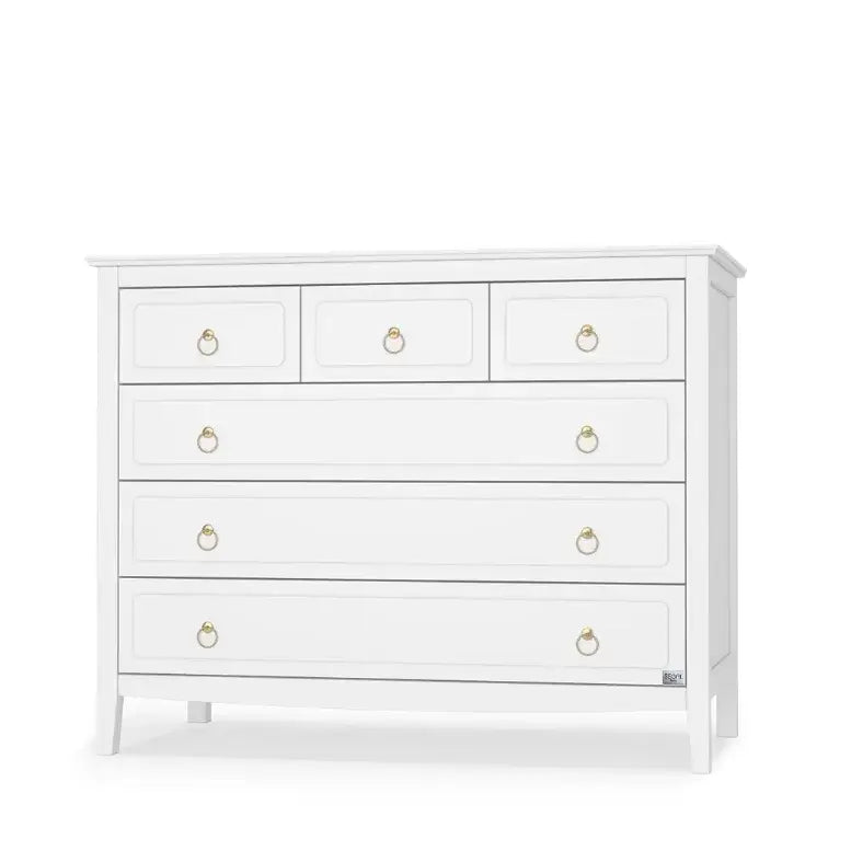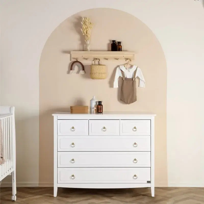 חדר עם עיצוב דומיננטי ומיוחד, המשלב בין מראה כפרי רגוע ועדין לבין נגיעות זהב שמוסיפות נופך יוקרתי ואלגנטי. השידה קרן עשויה MDF חזק ואיכותי, עם גימור צבע וחריטות בחזית ובדפנות, שמוסיפים לה את המראה הקלאסי והמעודכן. חלוקת המגירות החכמה והנוחה לשימוש מאפשרת אחסון מסודר של פריטי התינוק בצורה נגישה ומאורגנת.